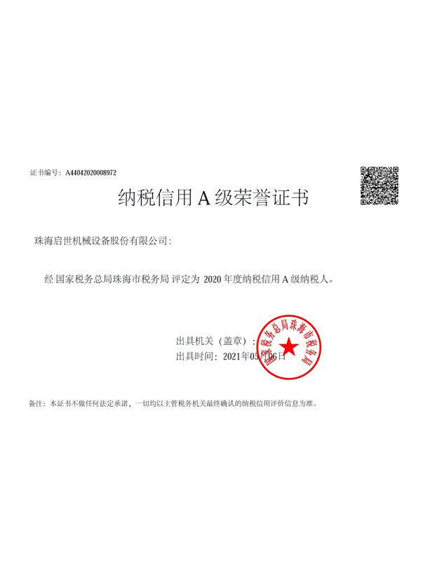 納稅信用A級榮譽證書
